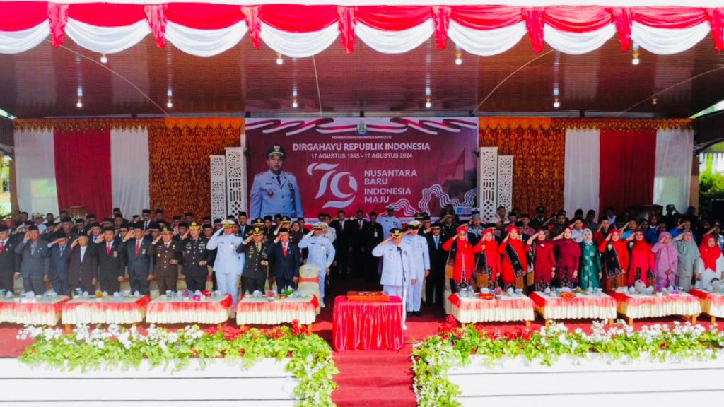 TNI AL, Simeulue,- Komandan Pangkalan TNI AL Simeulue Letkol Laut (P) Oyu Mulia Sukmana, S.T., M.T., M.Tr. Opsla., didampingi Ketua Cabang 8 Korcab l DJA I Ny. Meylina Oyu Mulia, pimpin Upacara Penurunan Bendera Sang Merah Putih dalam rangka Memperingati HUT Kemerdekaan RI Ke-79, bertempat di Lapangan Pendopo Bupati Desa Air Dingin, Kecamatan Simeulue Timur, Kabupaten Simeulue, Sabtu (17/08/2024).