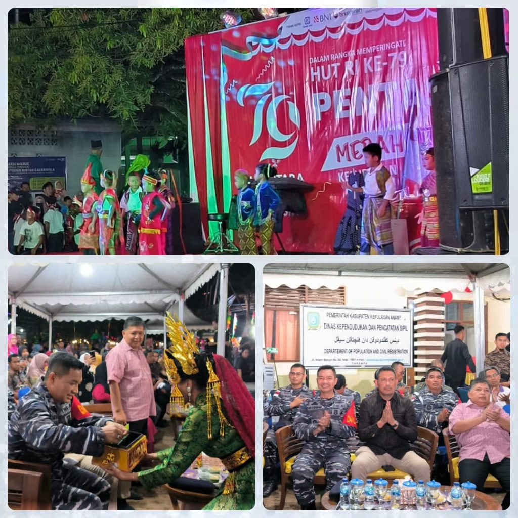 TNI AL, Kepulauan Anambas,- Dalam rangkaian menyambut peringatan Hari Ulang Tahun Ke-79 Kemerdekaan Republik Indonesia Tahun 2024 di Kabupaten Kepulauan Anambas, Komandan Lanal Tarempa Letkol Laut (P) Ari Sukmana, S.E., M.Tr. Opsla., turut hadir memeriahkan acara “Malam Pentas Merah Putih” yang di selenggarakan di Lapangan Taman Bermadah, Jalan Imam Bonjol, Kelurahan Tarempa, Kecamatan Siantan, Kabupaten Kepulauan Anambas, Jumat (16/8/2024).