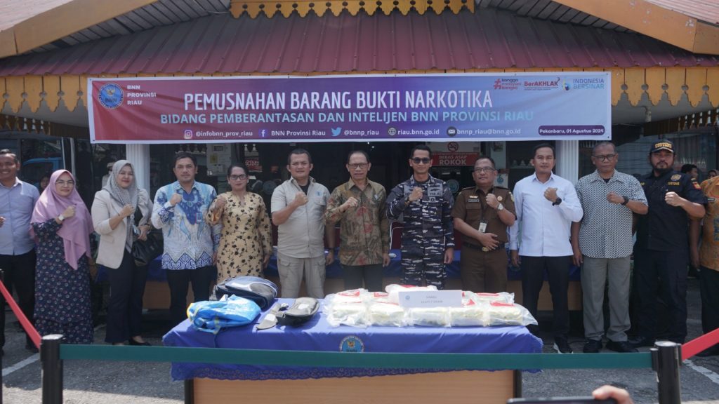 TNI AL, Dumai,- Bertempat di Kantor Badan Narkotika Nasional Provinsi (BNNP) Riau, Jalan Pepaya No.65, Kecamatan Sukajadi, Kota Pekanbaru, Komandan Lanal Dumai Kolonel Laut (P) Boy Yopi Hamel diwakili Pasintel menghadiri acara Pemusnahan Barang Bukti Sabu dengan netto hampir 11 Kg yang merupakan hasil tangkapan Tim F1QR Lanal Dumai, Kamis (1/8/2024).