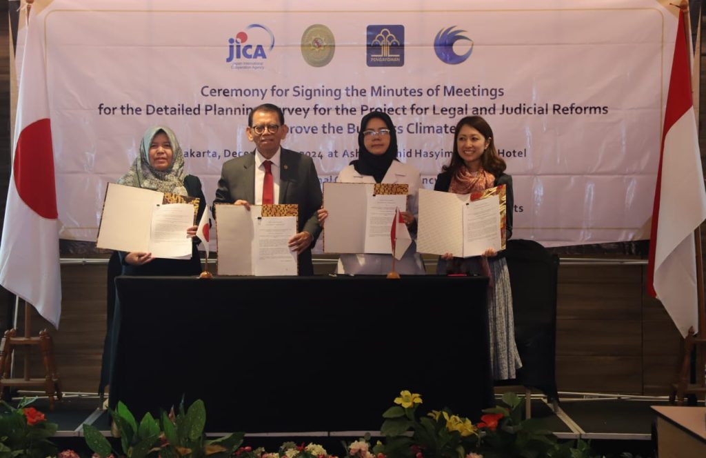 Untuk melanjutkan kerja sama tersebut, Ketua Kamar Pembinaan Mahkamah Agung Syamsul Maarif, S.H., LLM., Ph.D bersama perwakilan dari JICA, Kementerian Hukum dan Kementerian Hak Asasi Manusia (HAM) menandatangani minutes of meeting (MoM) pada Senin, 16 Desember 2024 di Jakarta.