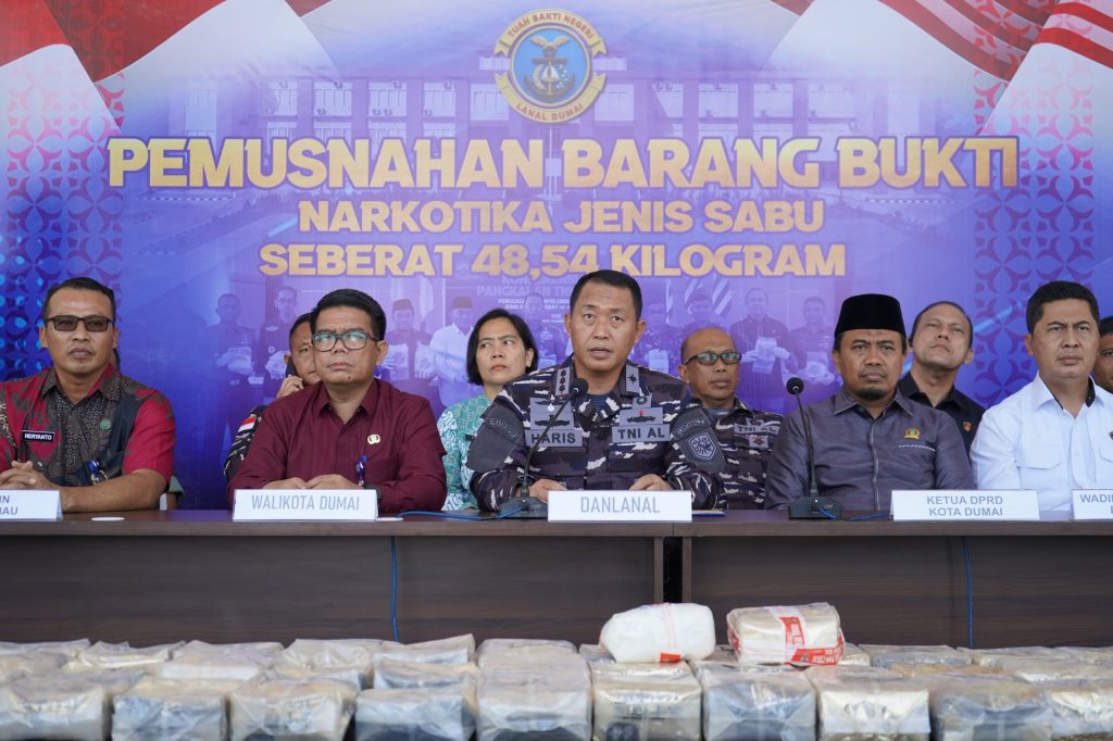 TNI AL, Dumai,- Dalam upaya nyata memberantas peredaran narkoba di Indonesia, Pangkalan TNI Angkatan Laut (Lanal) Dumai menggelar acara pemusnahan barang bukti narkotika jenis sabu seberat 48,54 Kg di Mako Lanal Dumai, Jalan Yos Soedarso No.01, Kota Dumai. Acara ini dipimpin langsung oleh Komandan Lanal Dumai Kolonel Laut (P) Abdul Haris S.E., M.M.D.S., yang didampingi oleh (PJU) Lanal Dumai, Kamis (12/6/2025).