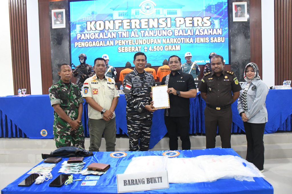TNI AL, Belawan, 5 Juni 2025,- TNI Angkatan Laut melalui Satgas Intel Gabungan Koarmada I kembali berhasil menggagalkan penyelundupan narkotika jenis sabu seberat ± 4.500 gram di Dermaga Belacan Tradisional, Desa Bagan Asahan, Kabupaten Asahan, Sumatera Utara. Estimasi nilai barang bukti yang berhasil diamankan sekitar Rp. 6.750.000.000 (enam milyar tujuh ratus lima puluh juta rupiah) dan menyelamatkan kurang lebih 22.500 jiwa dari penyalahgunaan obat-obatan terlarang.