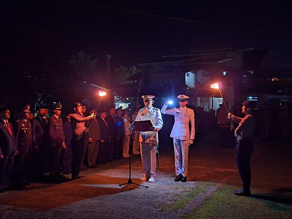 Kegiatan yang digelar pada malam hari tersebut berlangsung khidmat, dengan Komandan Pangkalan TNI Angkatan Laut Simeulue Letkol Laut (P) Wisnu Pryangga N, S.T., M.Tr.Opsla., bertindak sebagai Inspektur Upacara. Hadir dalam kegiatan tersebut jajaran Forkopimda, TNI-Polri, serta para pejabat daerah.