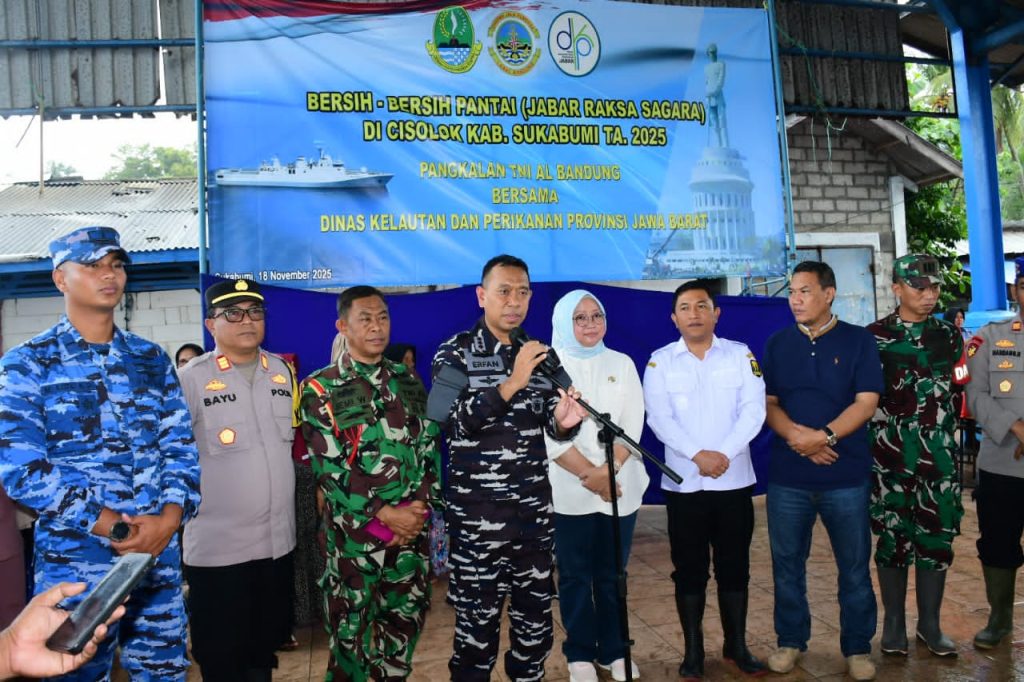 TNI AL , Bandung,- Pangkalan TNI Angkatan Laut (Lanal) Bandung bersama Dinas Kelautan dan Perikanan (DKP) Provinsi Jawa Barat menggelar aksi “Bersih Pantai Jabar Raksa Sagara” yang dihadiri langsung oleh Komandan Lanal Bandung Kolonel Laut (P) Erfan Indra Darmawan, S.E., M.Tr.Hanla., M.M., CIQaR., dan Kadis DKP Provinsi Jawa Barat Rinny Cempaka, S.Si., M.T. di Cisolok, Kabupaten Sukabumi, Selasa, (18/112025).