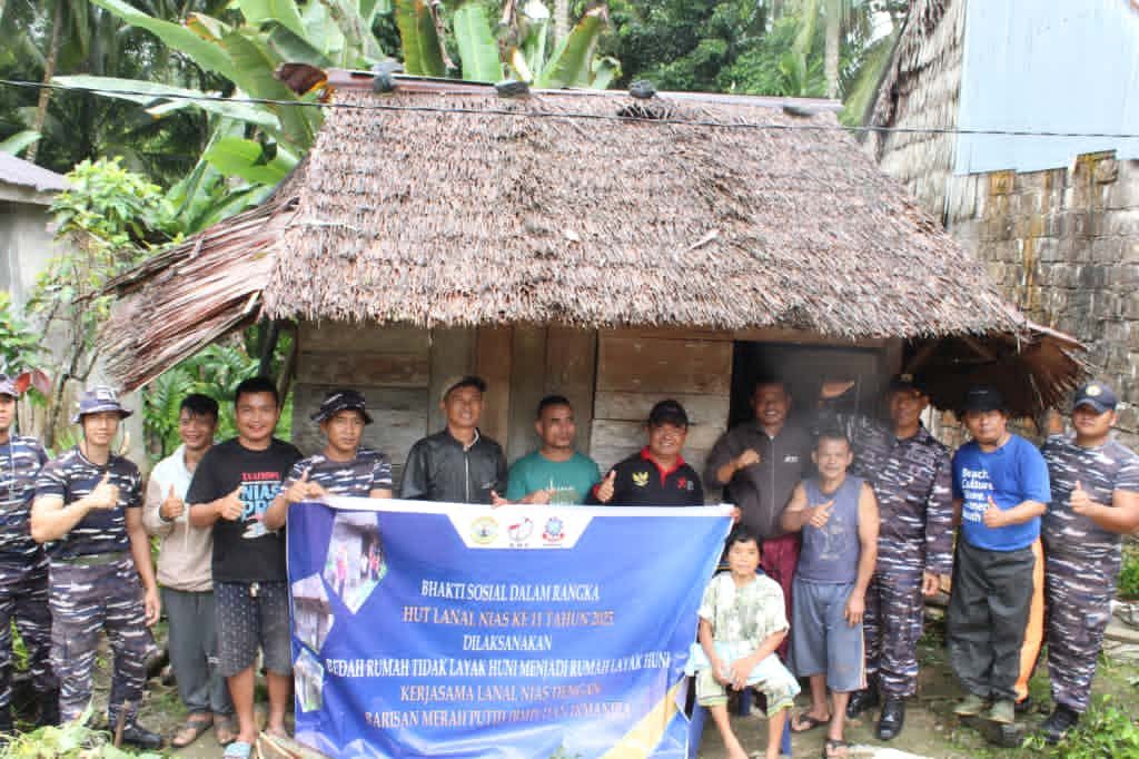 TNI AL, Nias Selatan,- Lanal Nias bekerjasama dengan Barisan Merah Putih (BMP) dan Ikatan Masyarakat Nias Utara (IKMANIRA) melaksanakan Bakti Sosial Bedah Rumah Tidak Layak Huni (RTLH) menjadi Rumah Layak Huni (RLH) kepada rumah Ibu Adinar Sarumaha dalam rangka memperingati HUT Lanal Nias Ke-11 Tahun 2025, bertempat di Desa Hilifarokhalawa, Kecamatan Fanayama, Kabupaten Nias Selatan, Provinsi Sumatera Utara, Kamis (20/11/2025).